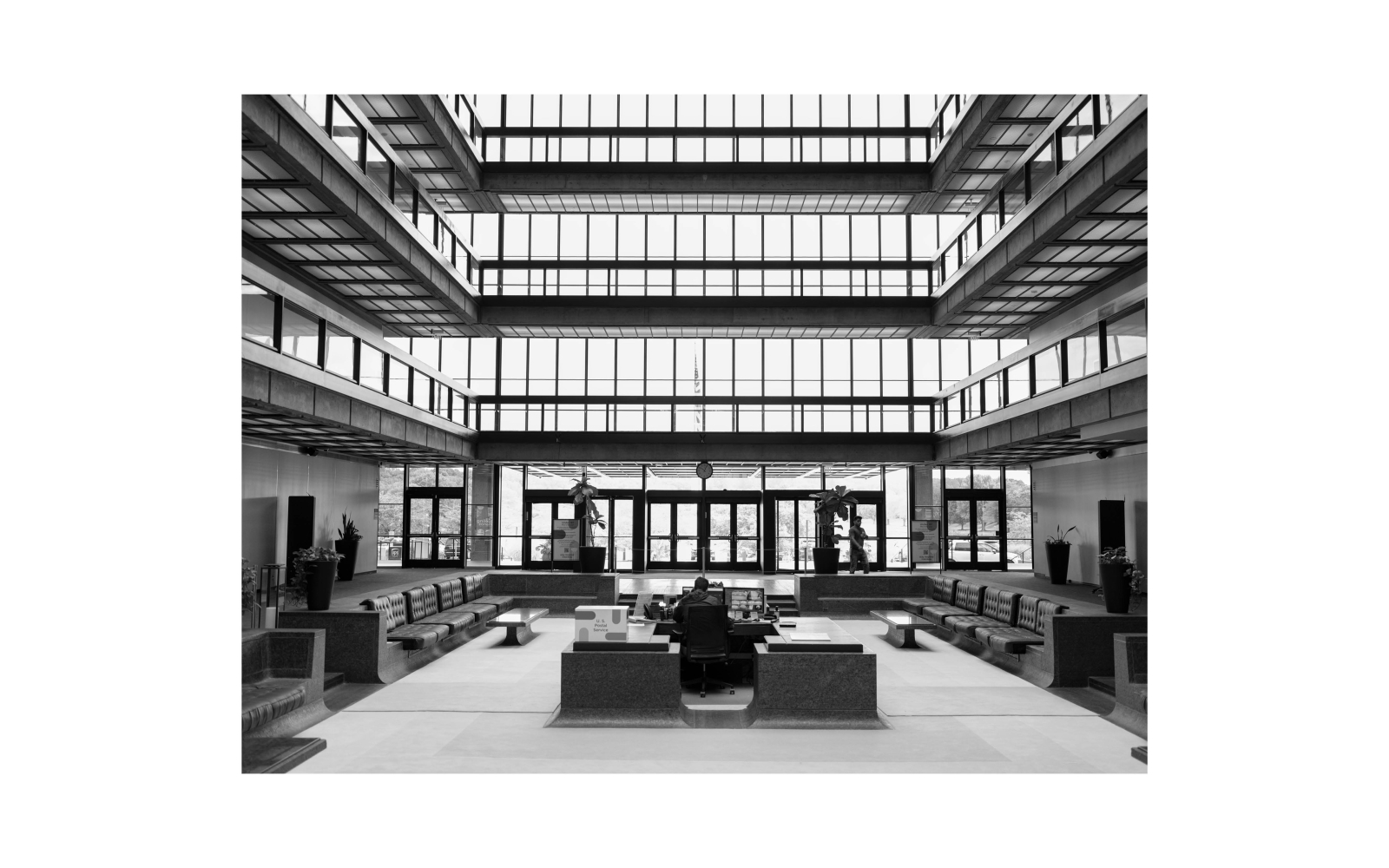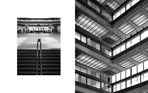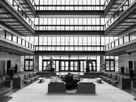 I spent an entire day wandering the atrium and manicured outdoor walkways feeling, thinking, and seeing what I imagined Eero Saarinen wanted (or didn’t want!) the inhabitants of this building to see and feel and think, my camera searching for compositions and forms that I hoped would reveal a version of the building that wasn’t the current and familiar depiction of the place. Saarinen’s design impresses as much as it provokes; the otherworldly reflections off the facade; the blissfully smooth curves of the sunken granite lobby and stairways; the linear walkways that seem to float along the perimeter of the atrium like walkways on a ship’s deck. You can’t help but feel transported – time moves differently within the space – and I wanted to try and capture this essence.