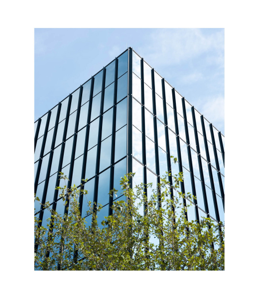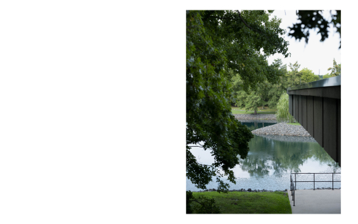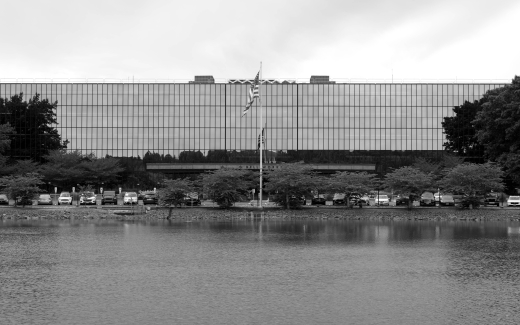 You see it through the trees as the road winds closer, a sliver at first (a corner) dark and linear and alien against the lush green landscape and tan-colored roofs of banal suburban development. Turning right off Crawfords Corner road into the campus, it emerges like a ship, waiting, its massive mirrored hull reflecting back the world and sky, pulling you in with some unknown force.