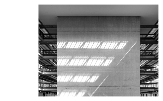 As you walk towards the front entrance, up the concrete stairs under the hundreds of orange glowing lights, you are met with your double, moving toward you in the reflection. It’s difficult to look away, because every angle is the same. As you get closer a shift occurs, revealing a glimpse of what's inside, and when the doors open you're immediately taken by light from every direction. Moving inward – as if walking between a veil into a new dimension – the entire structure suddenly appears wider, the ceiling somehow twice as tall as it was from the outside, and the further in you go the more the space reveals itself; the more you become captured by its presence.